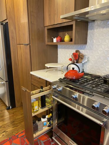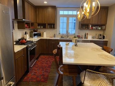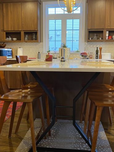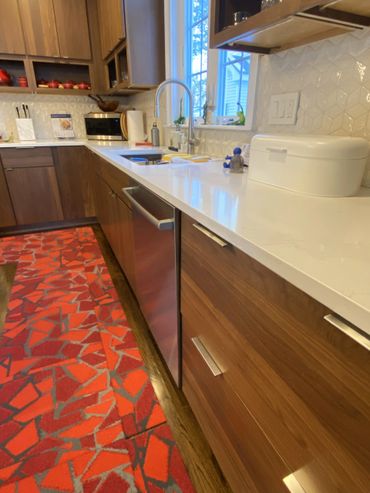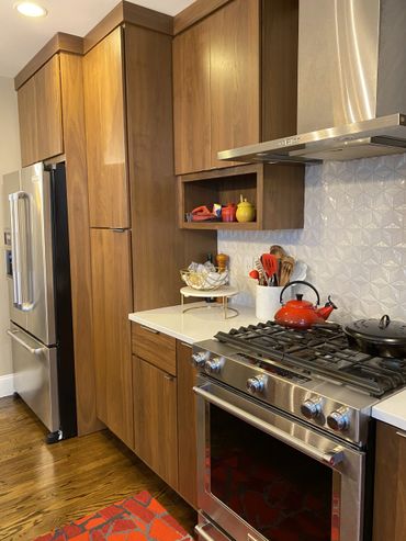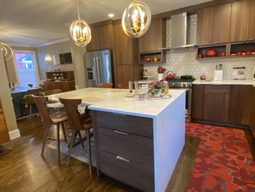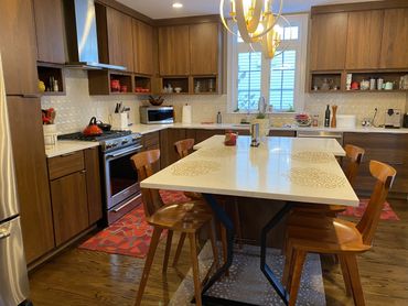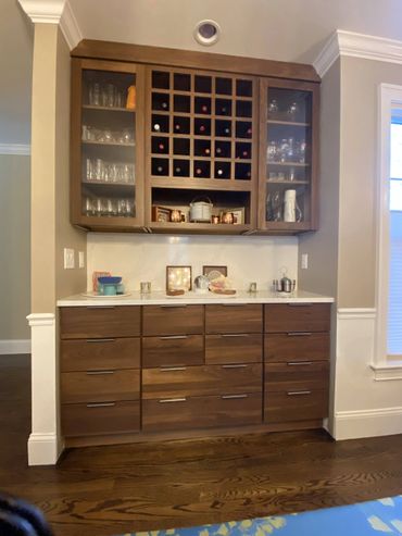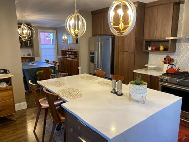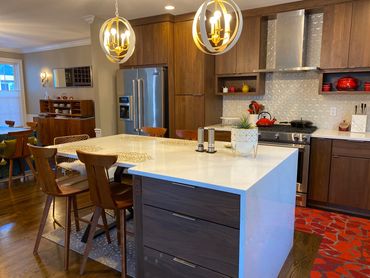 This mid century inspired kitchen and bar features cabinets from Fieldstone cabinetry in Walnut with Eternal Calacata gold tops from Silestone