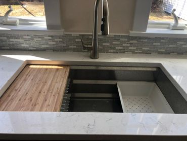 Cabinets from Waypoint Living Spaces 650 F painted linen. Countertop Caesar Stone Pebble